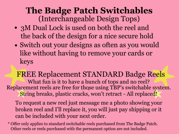 • replacement standard badge reels are free for those using The Badge Patch's switchable system.