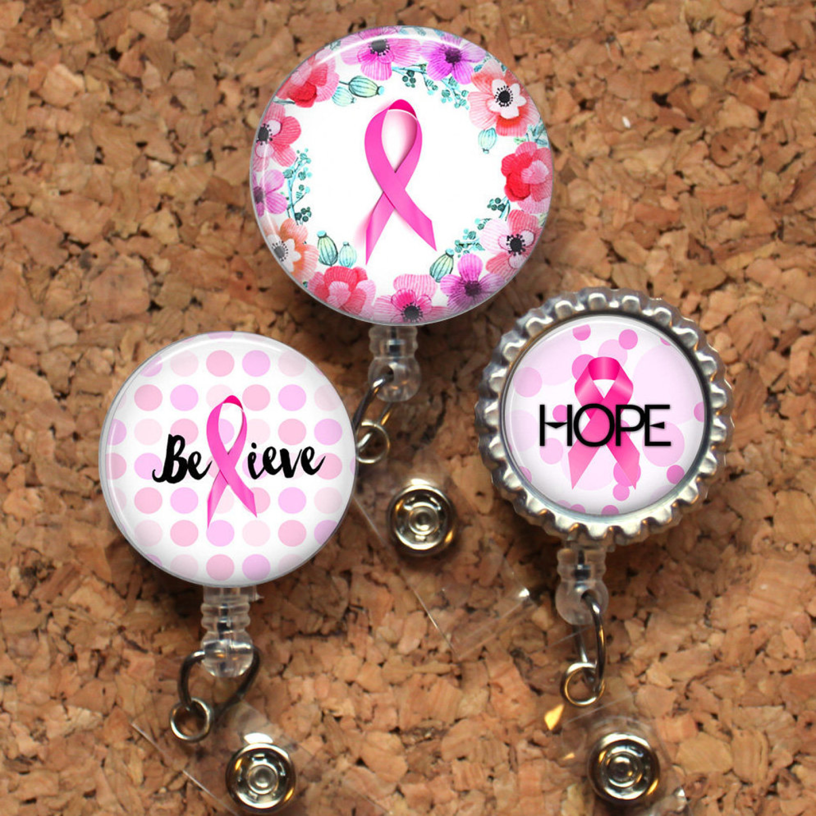Breast Cancer Awareness Badge Reel, Retractable ID Holder, Lanyard, Badge Pull, Card Holder, Carabiner, Stethoscope Tag, Mylar