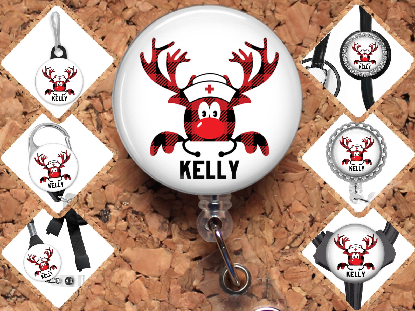 Christmas Badge Reel, Personalized Reindeer Nurse Retractable ID Holder, Lanyard, Stethoscope Tag, Carabiner, Zipper Pull, Pin Mylar 8056