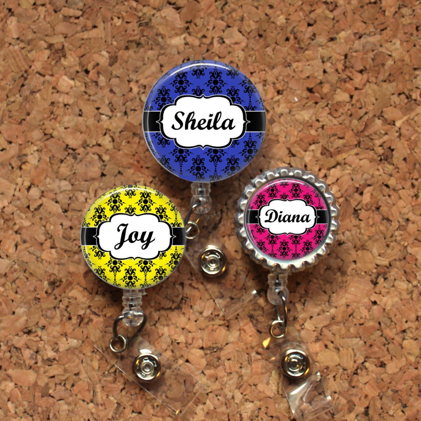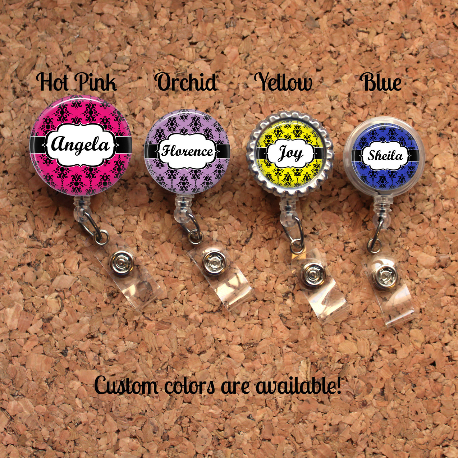Damask Badge Reel, Personalized Retractable ID Holder, Lanyard, Badge Pull, Choice of Colors, Carabiner, Stethoscope Tag, Mylar