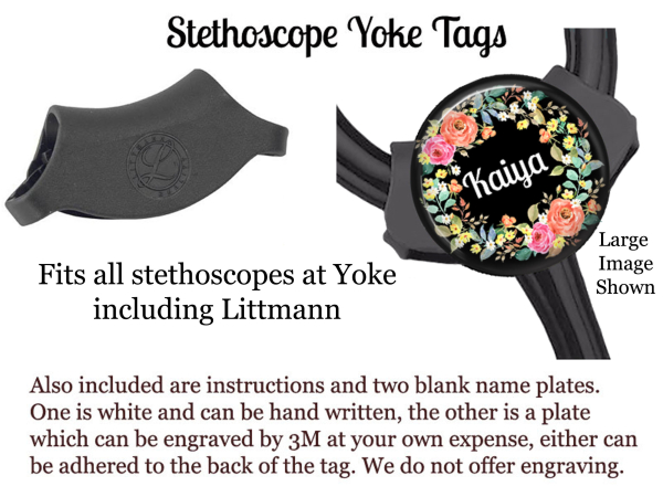 ✿ STETHOSCOPE YOKE TAG – These stethoscope tags fit all stethoscopes that have a yoke including Littmann. Included with your purchase are two name plates that can be adhered to the back of the tag, one that can be written on and the other engraved. We do not offer engraving as a service.