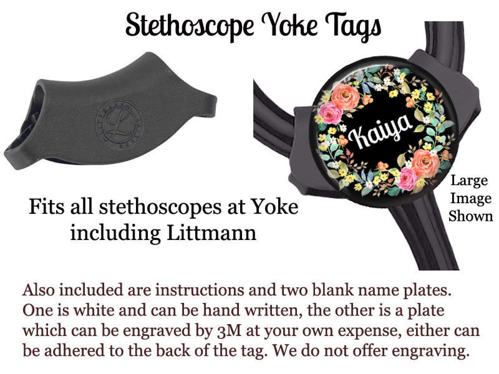 ✿ STETHOSCOPE YOKE TAG – These stethoscope tags fit all stethoscopes that have a yoke including Littmann. Included with your purchase are two name plates that can be adhered to the back of the tag, one that can be written on and the other engraved. We do not offer engraving as a service.
