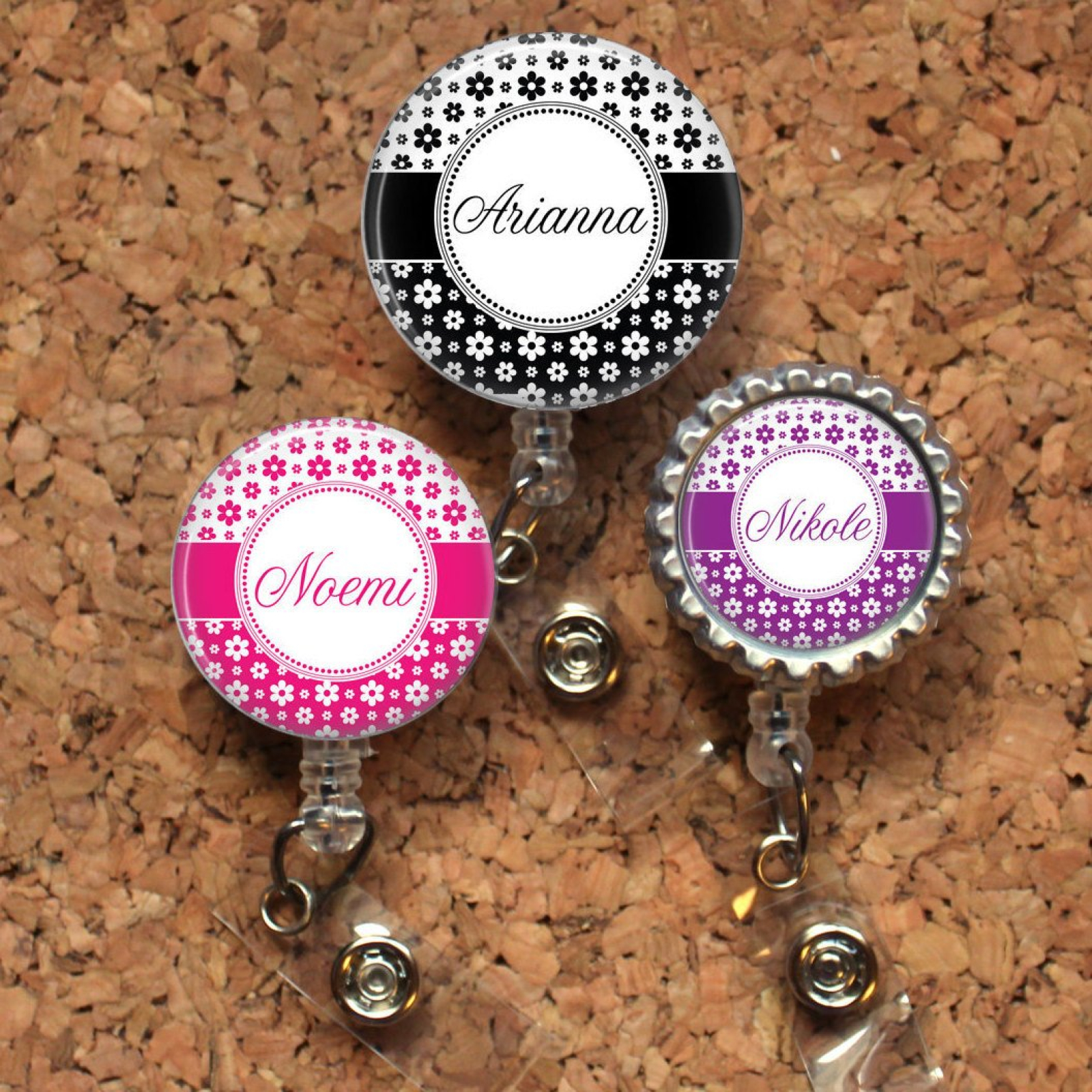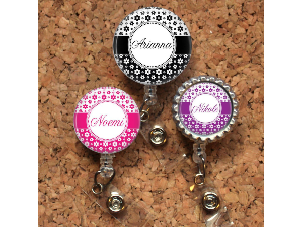Flower Badge Reel, Personalized Retractable ID Holder, Lanyard, Badge Pull, Choice of Colors, Carabiner, Stethoscope Tag, Mylar, Name