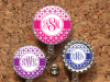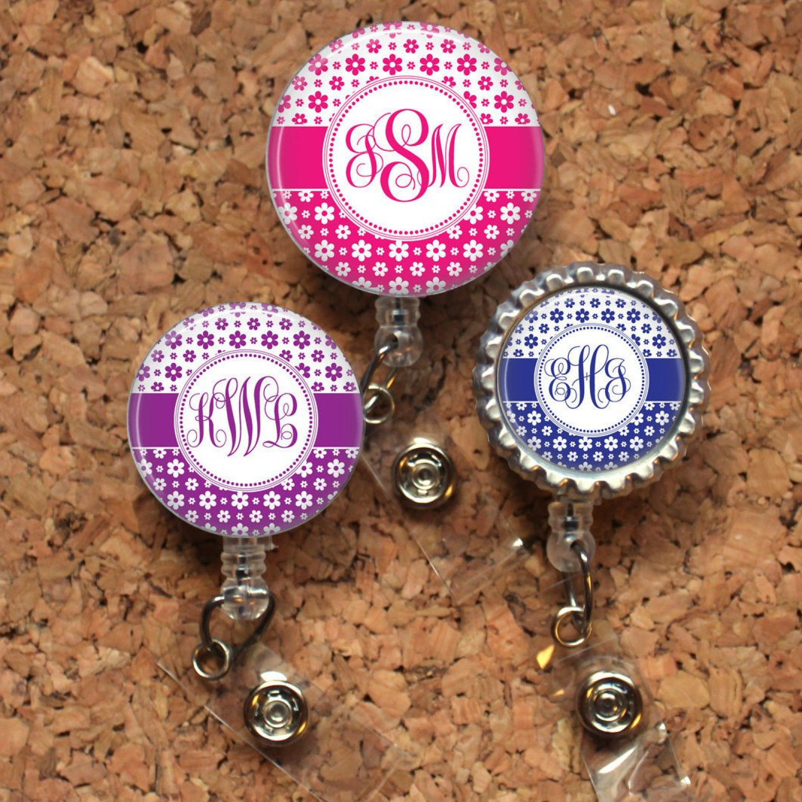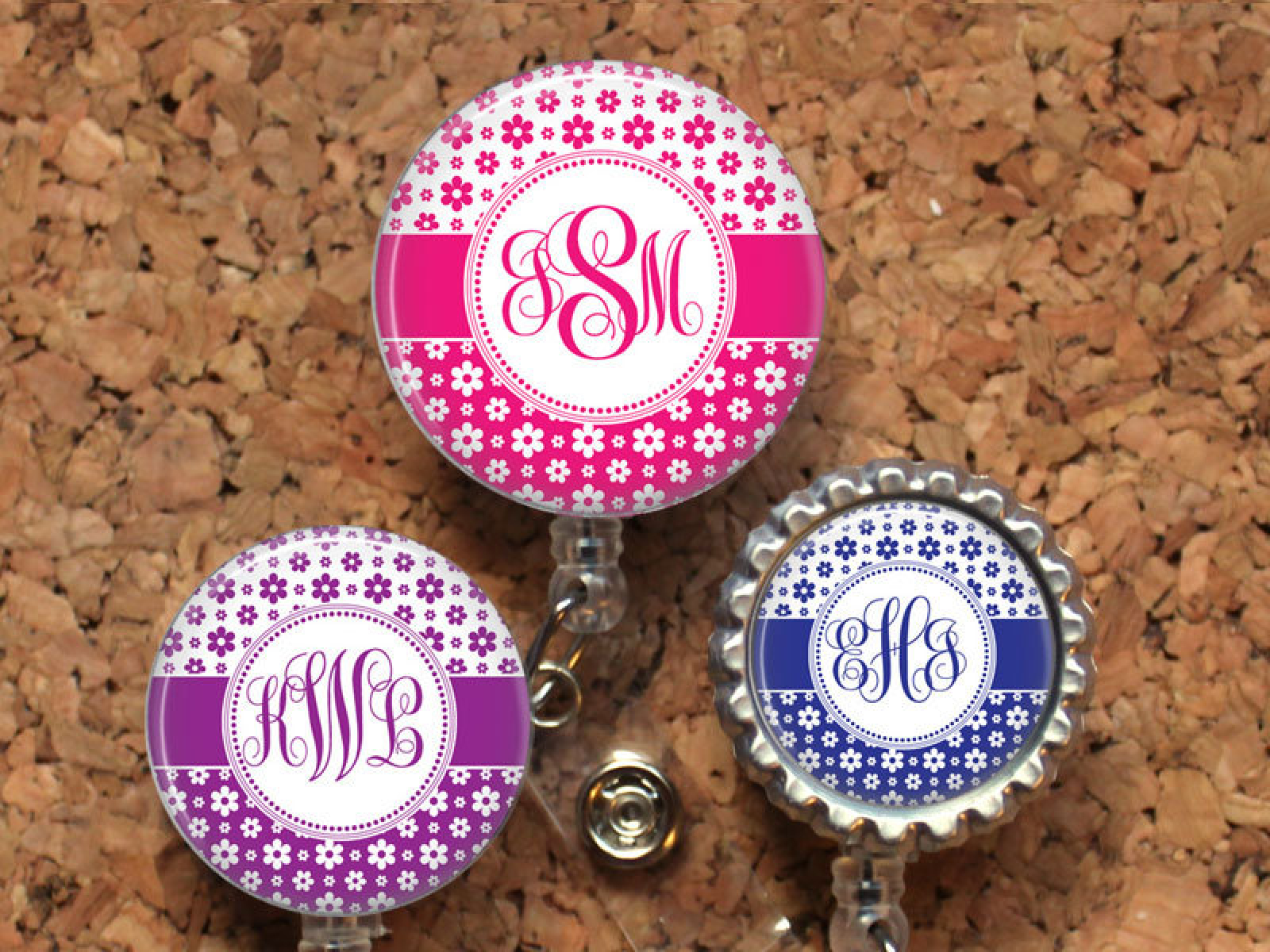 Flower Badge Reel, Personalized Retractable ID Holder, Lanyard, Choice of Colors, Carabiner, Stethoscope Tag, Mylar, Monogram Script