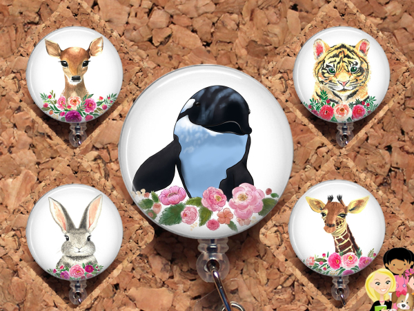 Giraffe Badge Reel, Bunny Retractable Lanyard Badge Holder, Deer Carabiner, Id Holder, Tiger Stethoscope Tag Killer Whale Mylar B1066