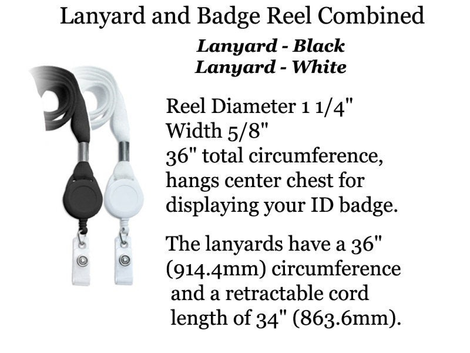 ✿ BADGE REEL - The retractable badge reels are offered in three styles. Belt Clip reels have a fixed clip which slides over your clothing at the neck line, the edge of a pocket, or over a belt. Swivel Clip reels have a 360 swivel pinch clip and can be attached to any part of your clothing. Pinch Clip reels have a non-swivel alligator pinch clip and can also be attached to any part of your clothing. Each badge features a clear round casing and clear vinyl strap with snap attachment. The reel diameters are 1 1/4" (31.75mm) and have a retractable cord length of 34" (863.6mm).