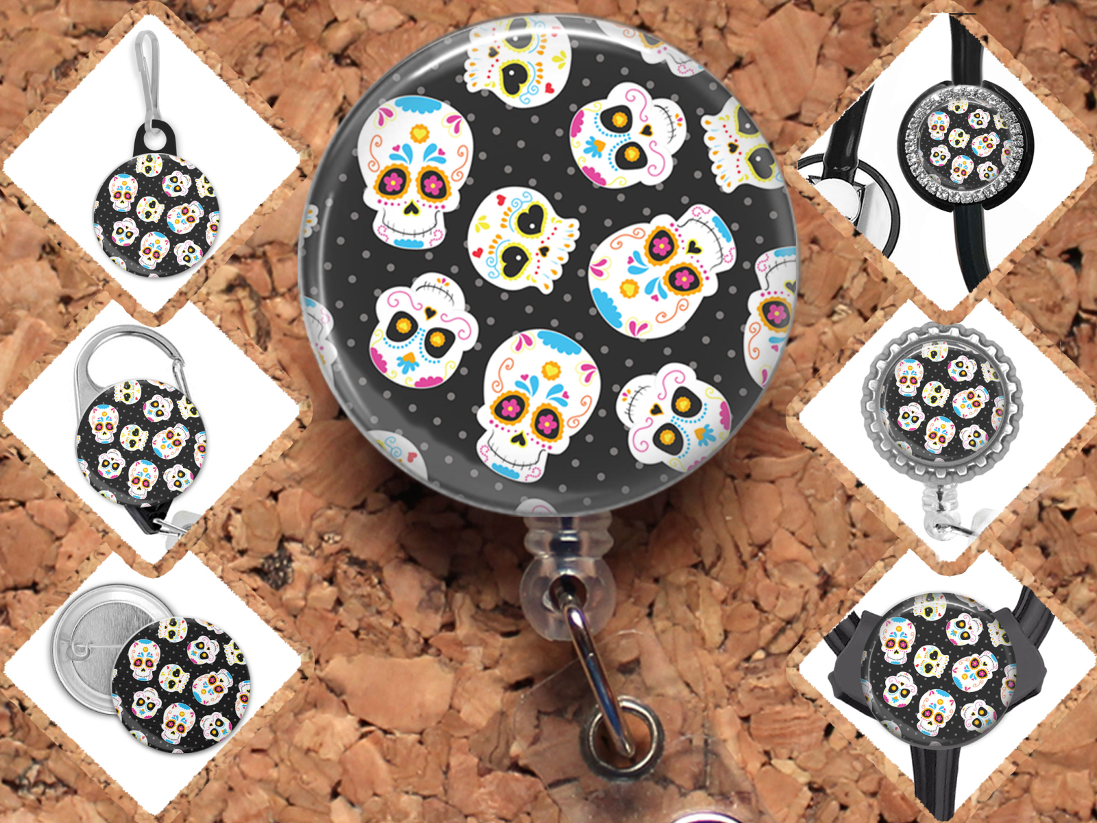Sugar Skull Badge Reel Id Holder, Badge Pin, Magnet, Lanyard, Stethoscope Tag 8236