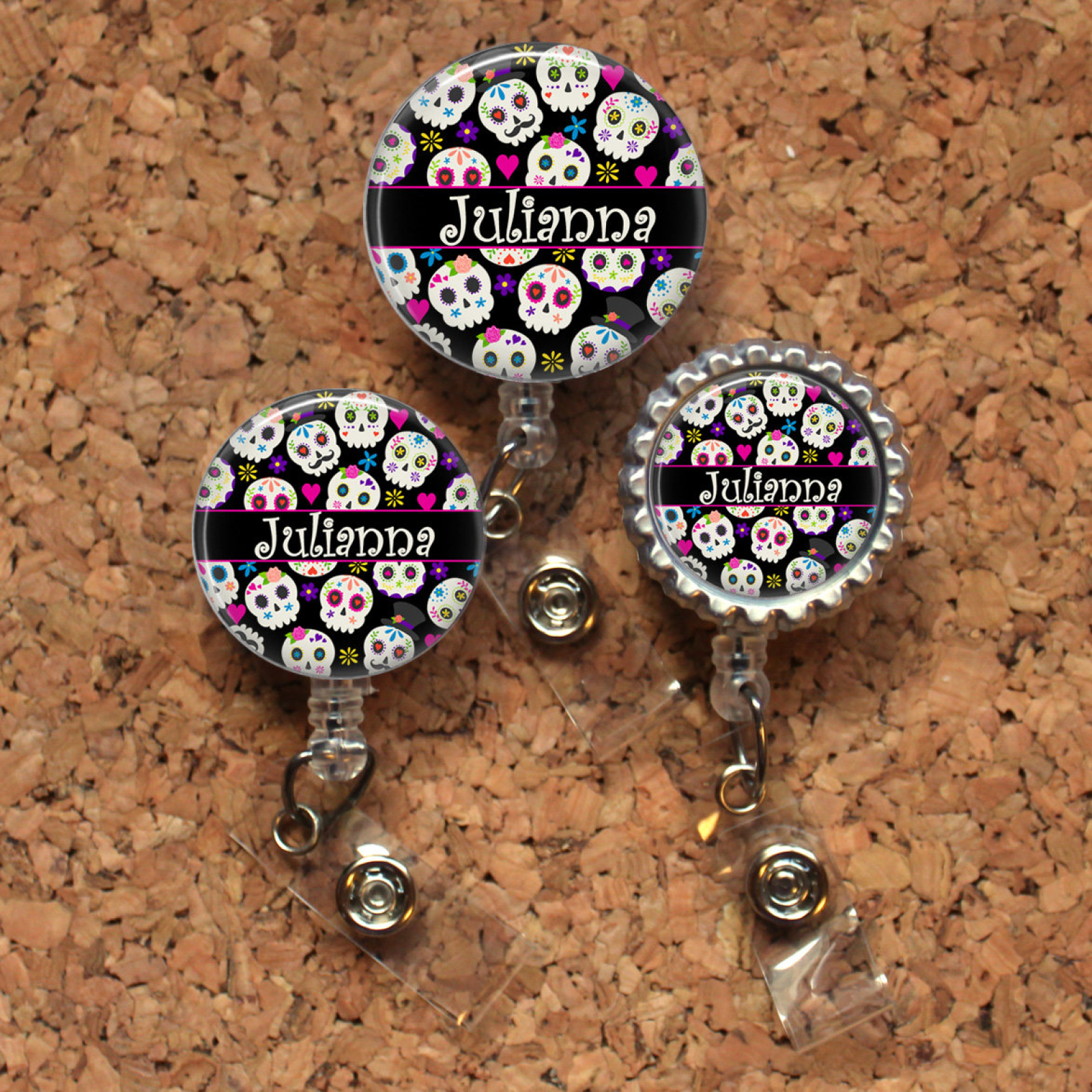 Sugar Skulls Badge Reel, Personalized Retractable ID Holder, Lanyard, Badge Pull, Card Holder, Carabiner, Stethoscope Tag, Mylar